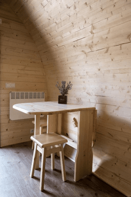 Jedes Leaf verfügt über zwei bequeme Boxspringbetten, einen Tisch mit zwei Stühlen und das notwendige Besteck, Geschirr und Tassen. Eine Kaffeemaschine ist vorhanden und Sie können optional einen Kühlschrank dazu buchen.
