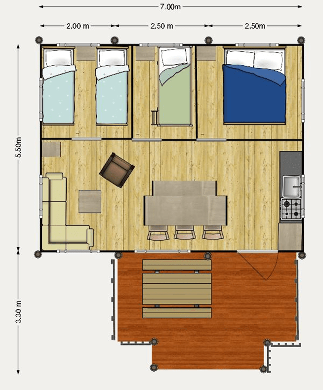 Das Zelt ist komplett eingerichtet mit bequemen Betten, einer gemütlichen Sitzecke und einer praktischen Küchenecke. Genießen Sie das Leben im Freien auf der privaten Terrasse, während die Kinder sicher in der umliegenden Natur spielen können.